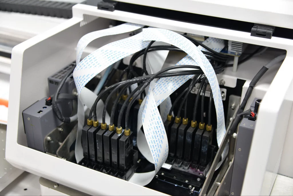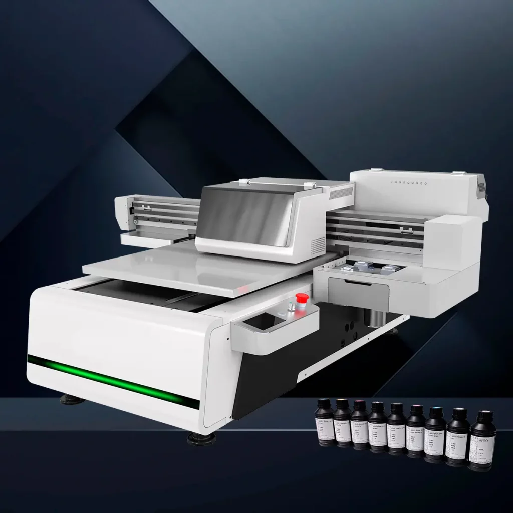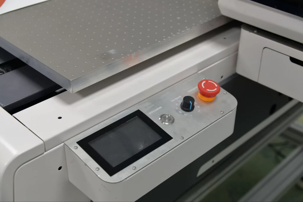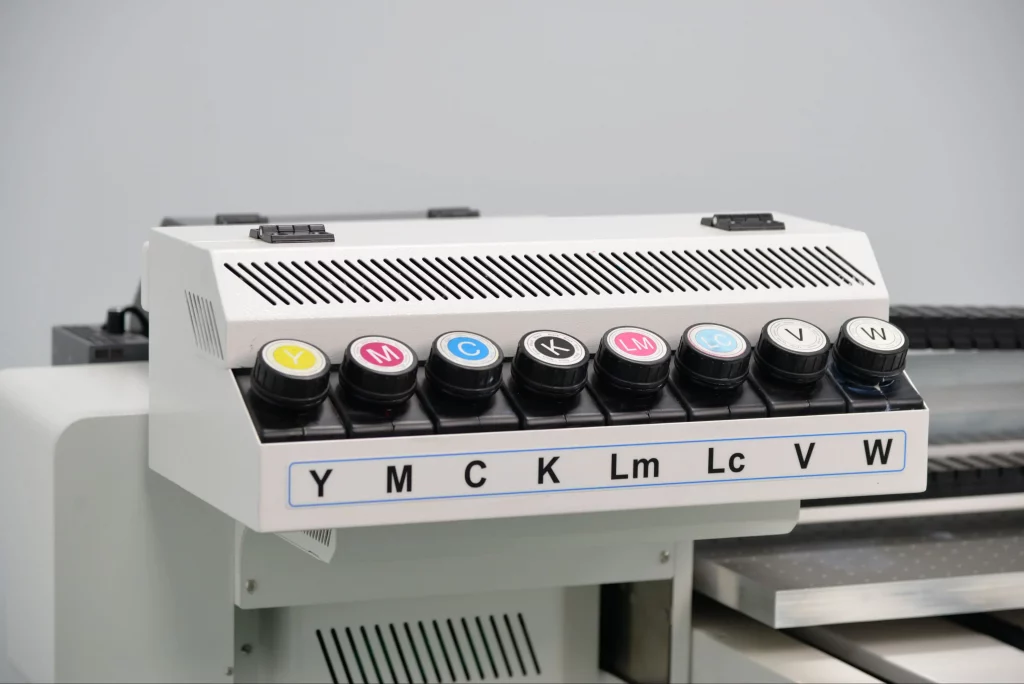 The printer applies UV ink directly to the surface and cures it with ultraviolet light, after which the ink instantly polymerizes and hardens.