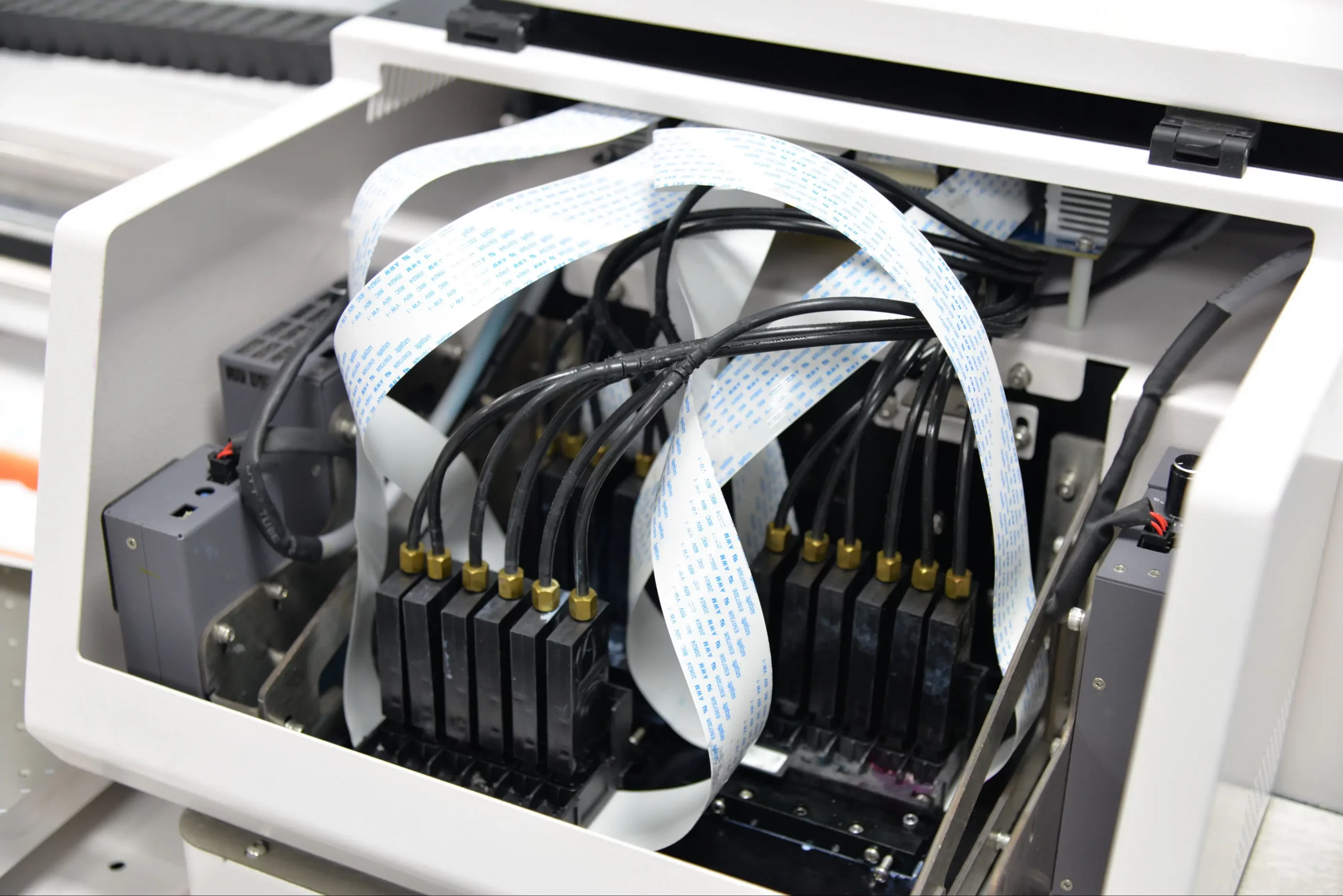 The 6090 UV printer is a modern printing system for hard surfaces. The printer has a vacuum table, ink mixing, and three print heads.
